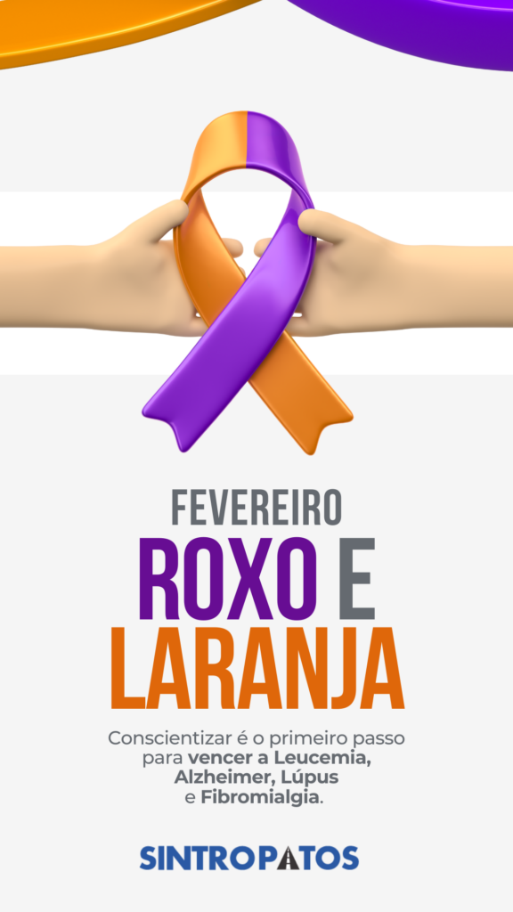 O SINTROPATOS apoia a Campanha Fevereiro Roxo e Laranja, um importante momento de conscientização sobre doenças que muitas vezes são silenciosas, como Alzheimer, Lúpus, Fibromialgia e Leucemia. Cuidar da saúde é um direito de todos os trabalhadores, e a informação é o primeiro passo para o diagnóstico precoce, o tratamento adequado e a melhoria da qualidade de vida. O sindicato reforça que saúde também é pauta sindical.